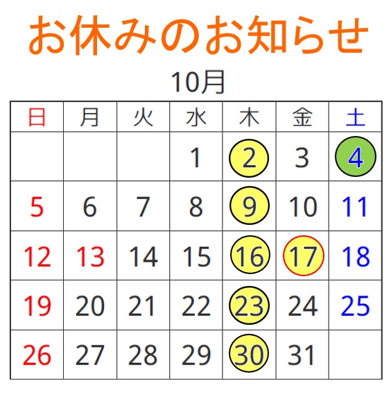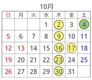 10月の定休日は下記カレンダーの黄色の丸印の日です。