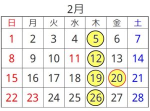 2月の定休日は下記カレンダーの丸印の日です。
